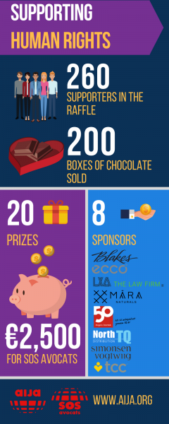Last May, AIJA members successfully raised €2,500 EURO in support of SOS Avocats in a Human Rights Raffle at the AIJA Half-Year Conference in Warsaw. Thank you to our sponsors: Blake, Cassels & Graydon LLP, ECCO, LXA The Law Firm, MaraNaturals, Mogens Daarbak, North TQ Distribution, Simonsen Vogt Wiig, TCC Global; and the members who made this possible.