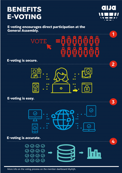 AIJA welcomed e-voting last year and due to its resounding success we will be using it again at the Annual Congress! We are excited to use e-voting to elect a new Vice-President of AIJA as well as a new treasurer and the partial renewal of the Executive Committee. We’ll also be using e-voting for any resolutions proposed to the General Assembly on Saturday, 7 September. Below are some of the benefits of e-voting to be experienced in Rome next month!